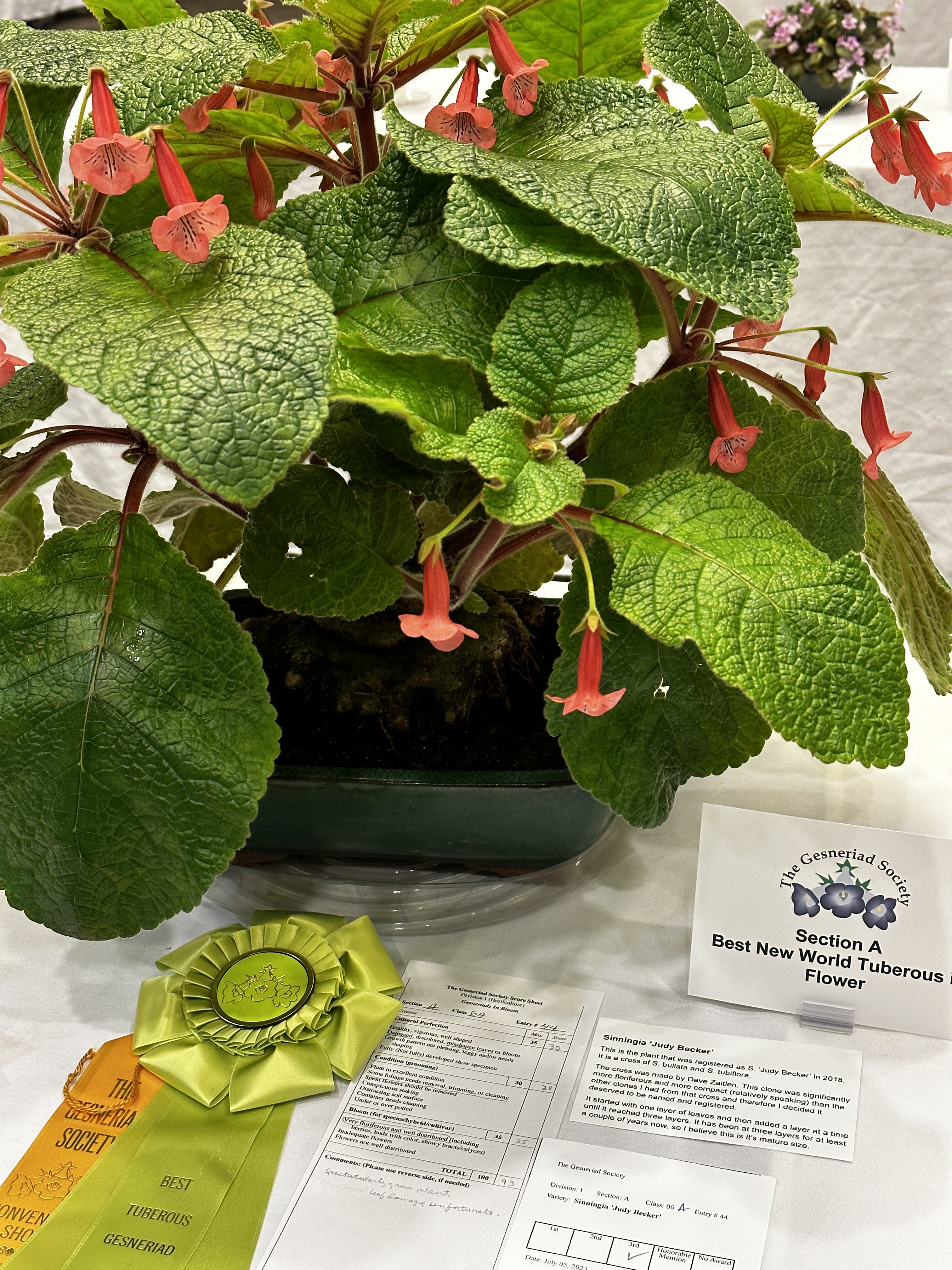 Sinningia 'Judy Becker" is a cross of S. bullata and S. tubiflora created by Dave Zaitlin. As was apparent by the awarded plant in the show, the plant can develop into a large display. After a little over a year, my plants remain a manageable size under lights.